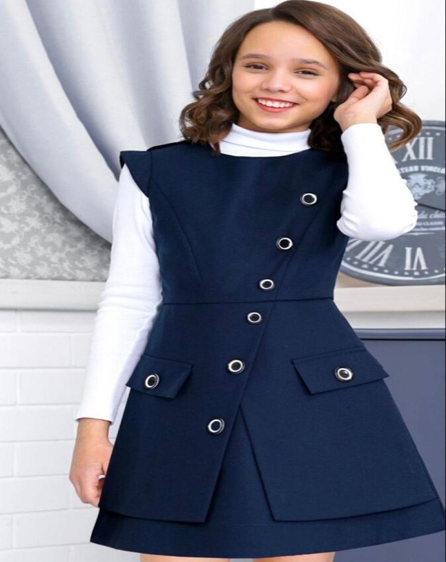 Школьная форма для девочек под заказ. Белый базовый гольф и темно-синий сарафан в классическом стиле. Сарафан украшен декоративными люверсами и накладными карманами, аккуратно сидит по фигуре и подходит для повседневной носки. Ткань приятная, плотная, хорошо держит форму.