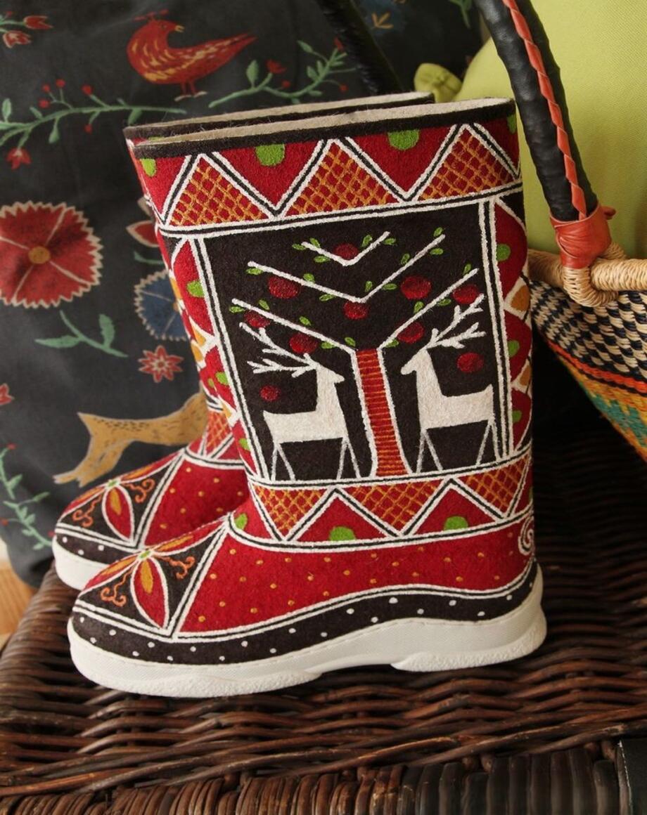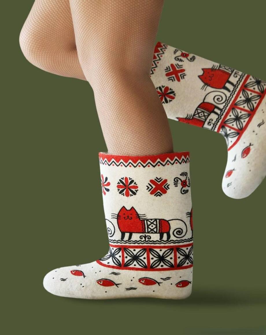 Валенки из войлока ручной работы — изготовлены из натуральной овечьей шерсти методом валяния. Очень тёплые, дышащие и прочные. Подходят для зимних прогулок, дачи или дома. Возможен декор: ручная вышивка, орнаменты, аппликации, мех.